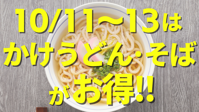 10月11~13日の3日間は「かけうどん・そば」を300円でご提供!
